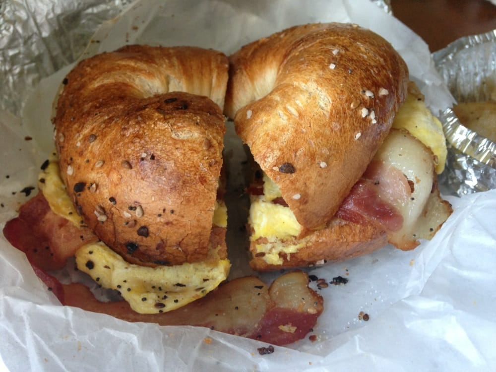2 organic eggs, grilled ham, bacon and cheese on a bagel.